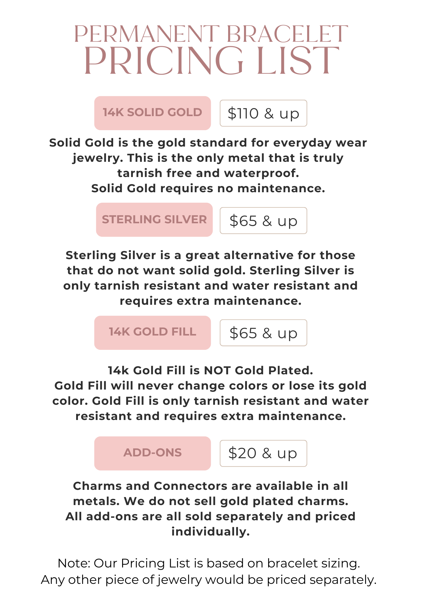 We only use high-end recycled 14k solid gold, 14k gold fill & sterling silver chains and charms. Our permanent jewelry jump rings are always 14k solid gold, providing you with the best connection. The best option for the longest shine and durability will always be 14k solid gold. Sterling Silver may be reactive with chemicals or salt (sweat, salt water, etc) but can be cleaned with soap and water. 14k gold-fill, with proper care, can last a really long time. Decades even. It will never compare to 14k solid gold but it's a great alternative for the budget conscious.