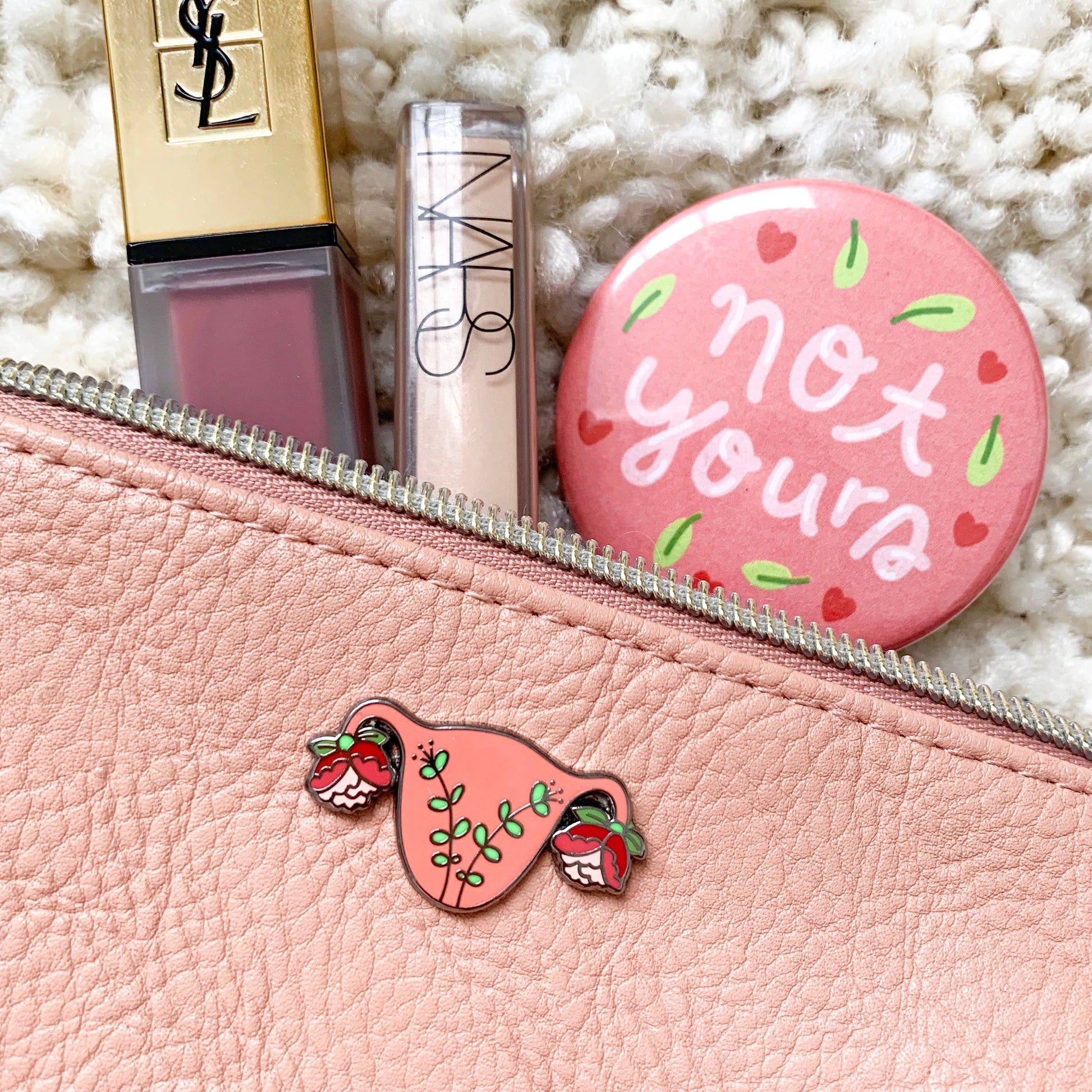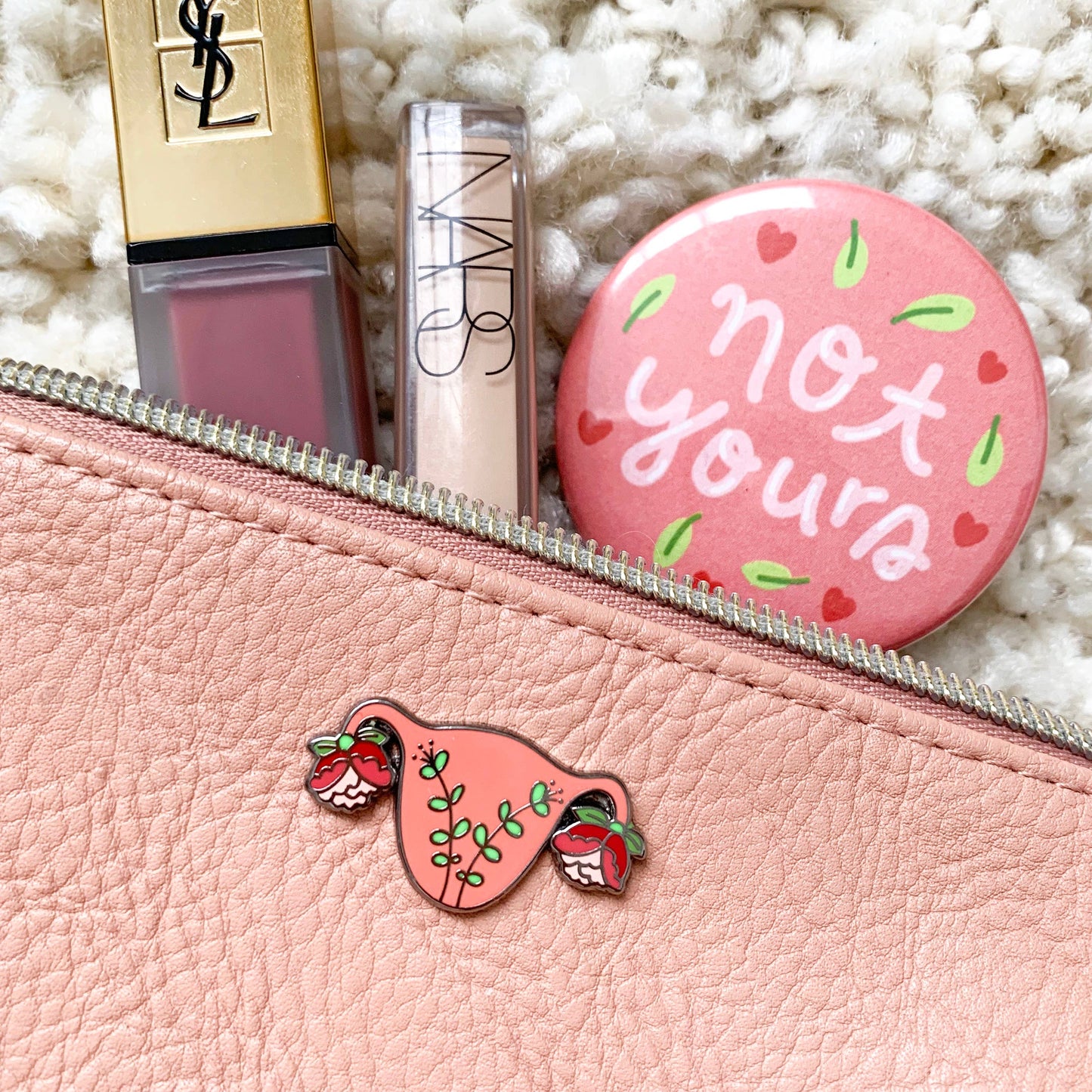 Feminist enamel pin featuring a floral illustration of a blooming uterus. Cute and empowering, this pin is designed to celebrate and empower women and girls. Perfect small gift for: ♥ Doulas, nurses, OBGYNS, and new & expecting mothers! ♥ Celebrating pregnancy ♥ Those who champion women's rights & reproductive rights 1.25" hard enamel pin. Packaged on paper backing cards, in cello sleeves. Smooth polished surface & rubber clutches for comfort.