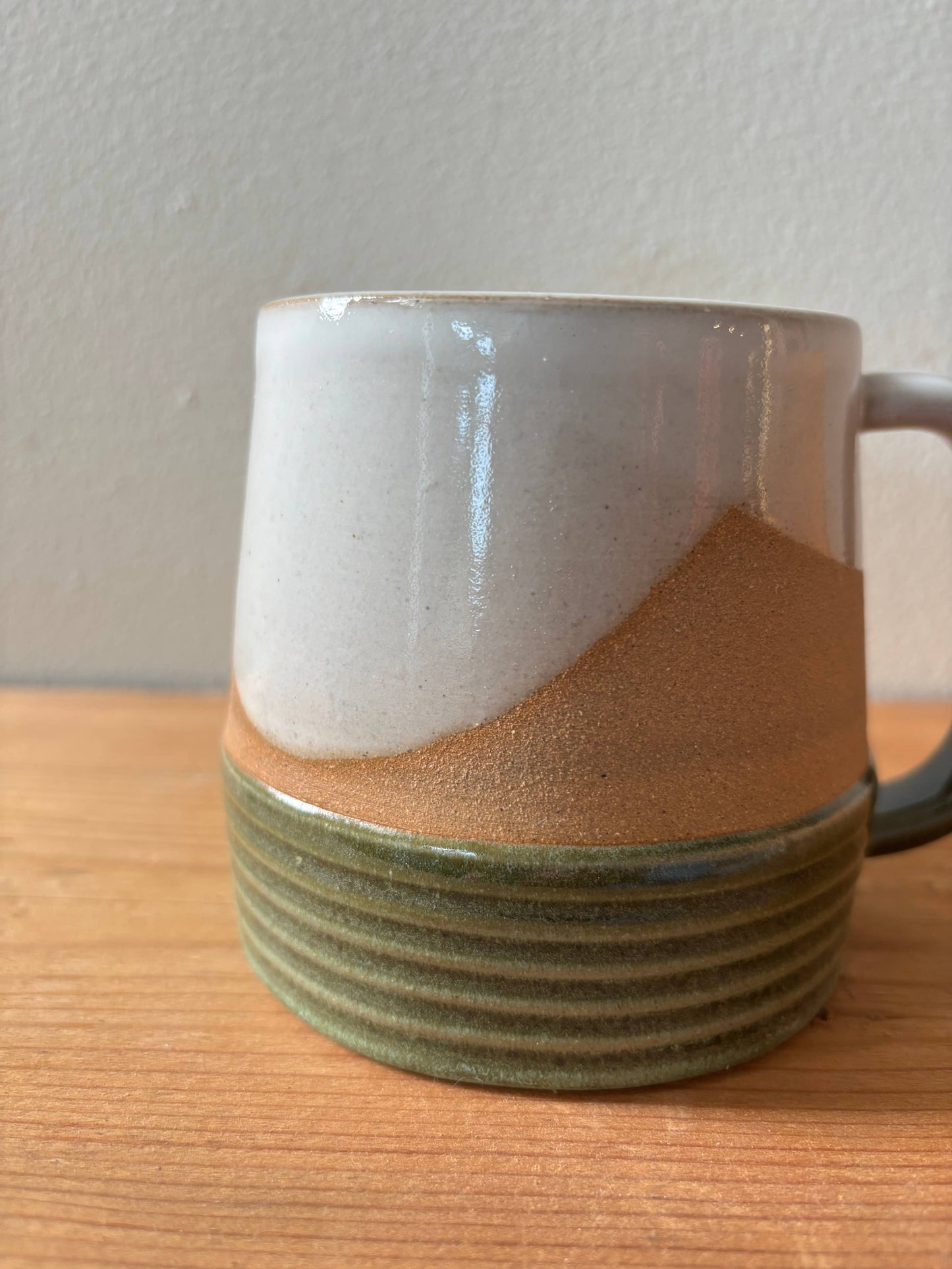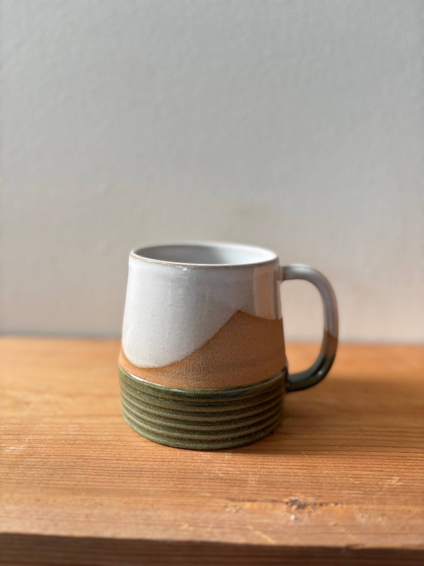 This thoughtfully designed mug features a horizontal reeding design at the base, creating a unique texture to highlight the the nuanced color accents. With special attention to the size and pitch of the handles, this mug is exceptionally comfortable and functional. These hand thrown ceramics pieces are both microwave and dishwasher safe, making it perfect for everyday use. The sleek and modern aesthetic complements any kitchen décor.