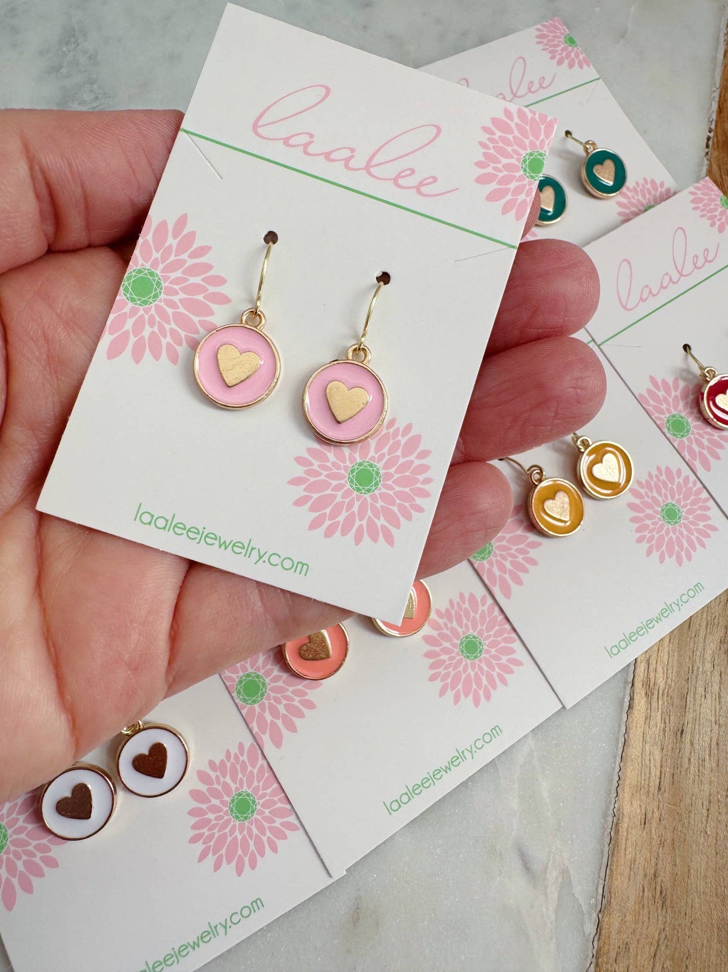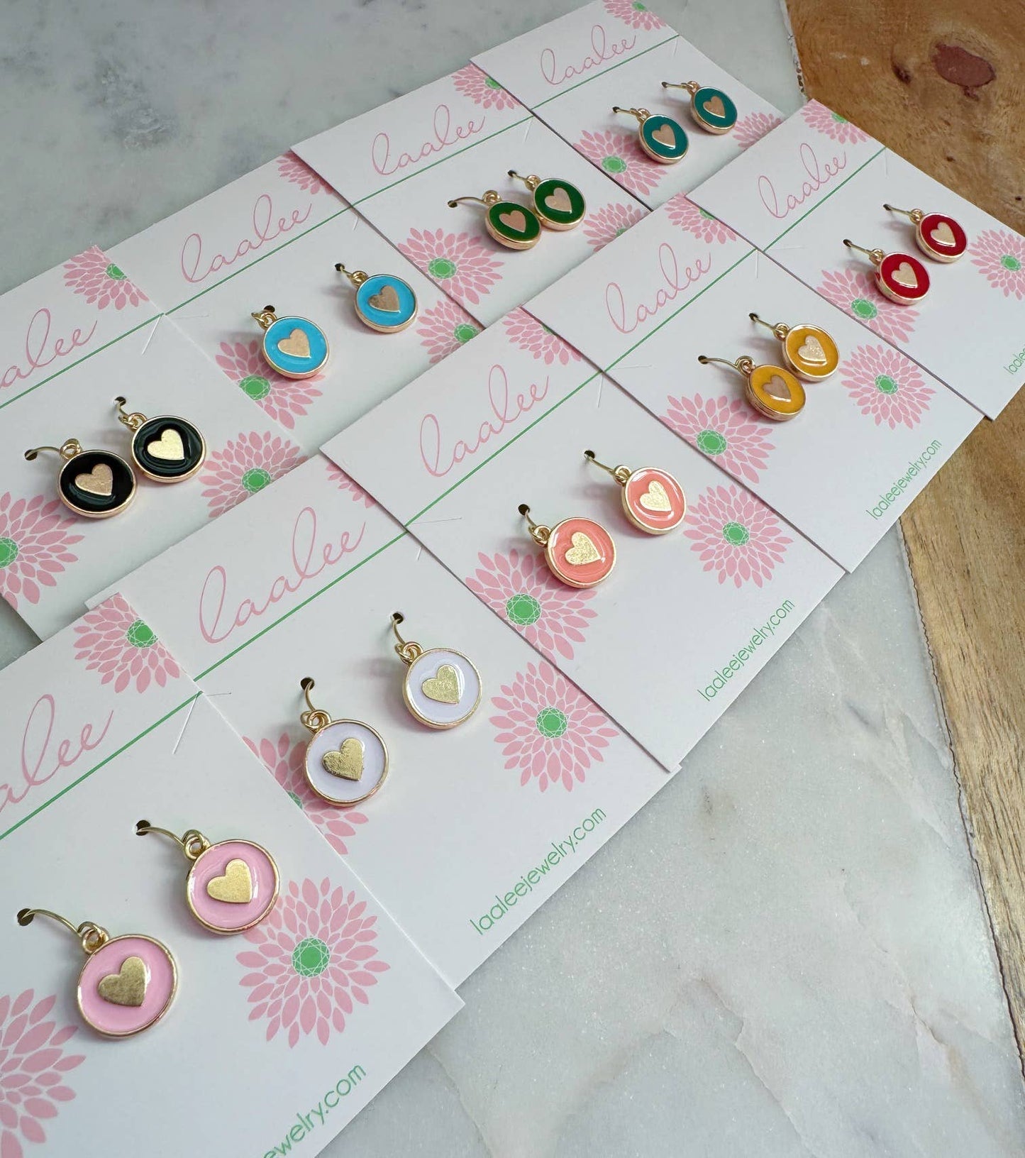Timeless and dainty colorful heart pendant earrings! Measures approximately 1".