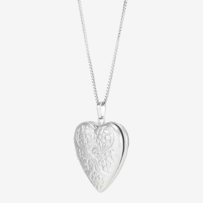This lovely sterling silver necklace features a 20.6 x 28.6mm heart-shaped locket on a box chain. The locket is set with one 0.01-ct round white diamond (I2–I3 clarity/G–I color) and has a floral design on the front. This necklace is finished with a spring ring clasp. Rhodium plating provides a durable, tarnish-resistant finish.