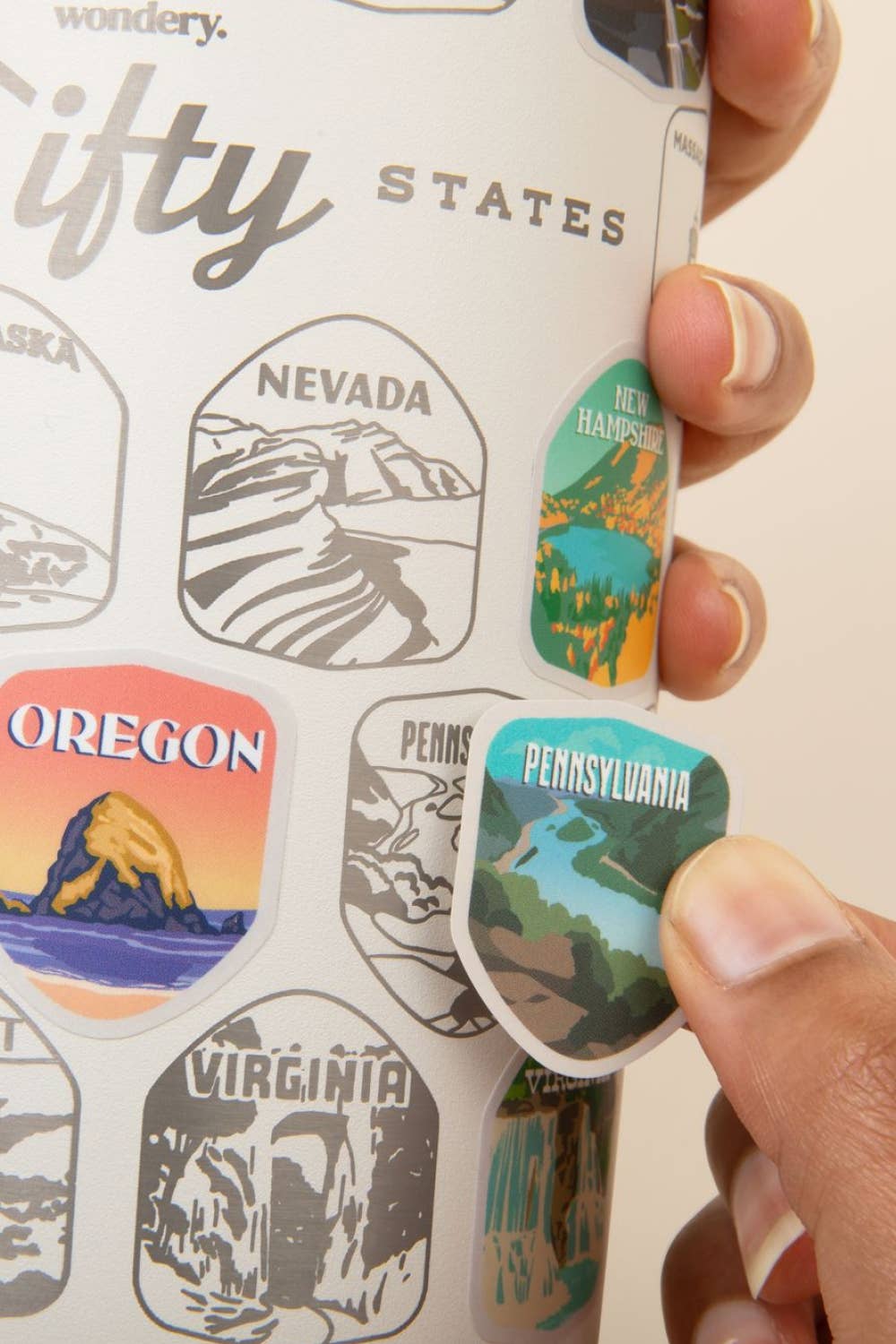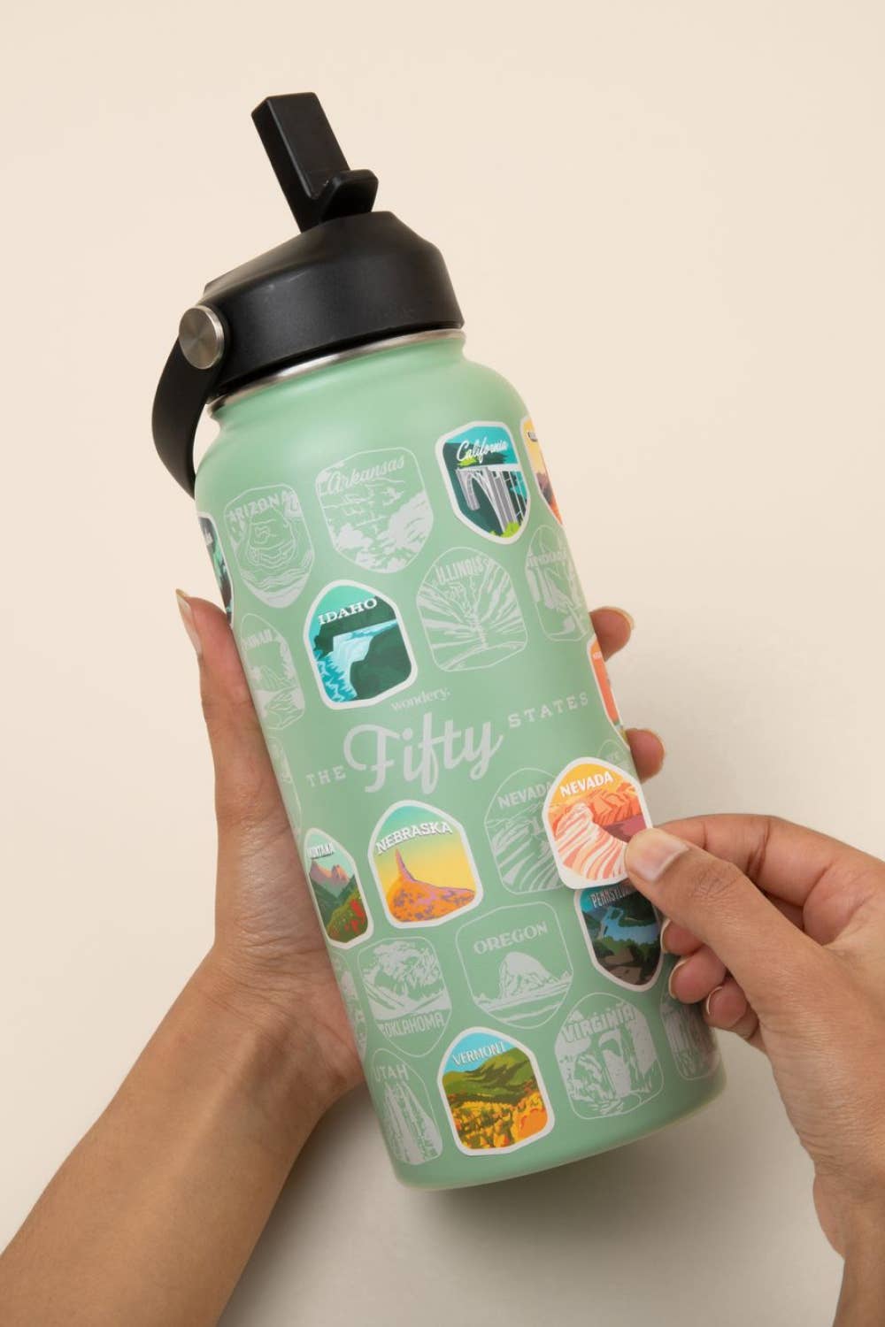 Cross state lines and cross off your bucket list. The Fifty States Bucket List Water Bottle is your adventure companion for exploring United States' diverse regions. Track your travels and celebrate each new visit with a uniquely illustrated, weather-proof sticker. Buckle up and rev your engine —your great American 50 states trip starts now!