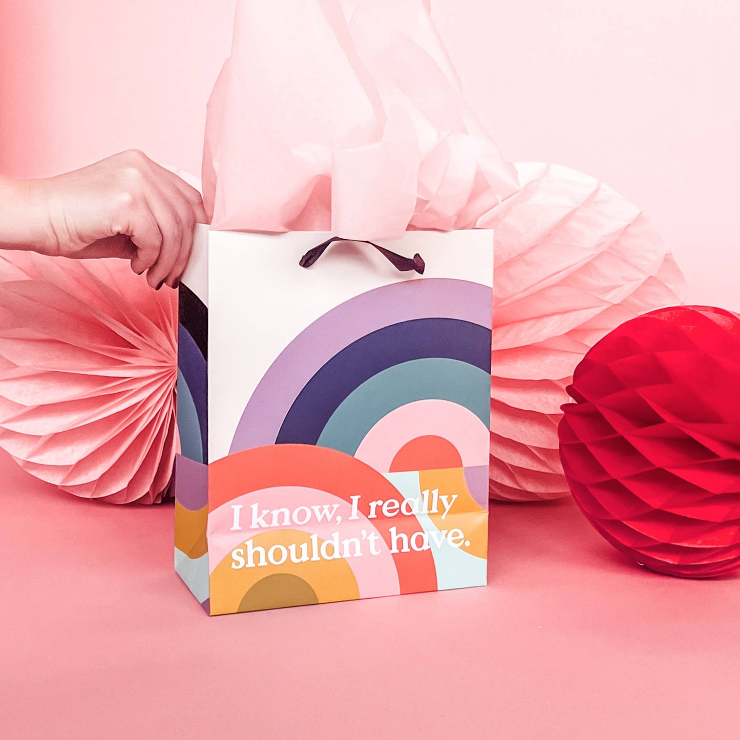 • Size: 9.75" x 7.75" x 4"D • Ultra-thick matte-laminated gift bag • Gold foil embellished on front • Black grosgrain ribbon handle • Removable plastic hang tab • Designed in the USA / Imported This limited edition gift bag features cotton grosgrain handles, and is embellished in gold foil. With a bold, vibrant design paired with playful text that's sure to make them smile, the bag's sturdy construction allows it to be used again and again.