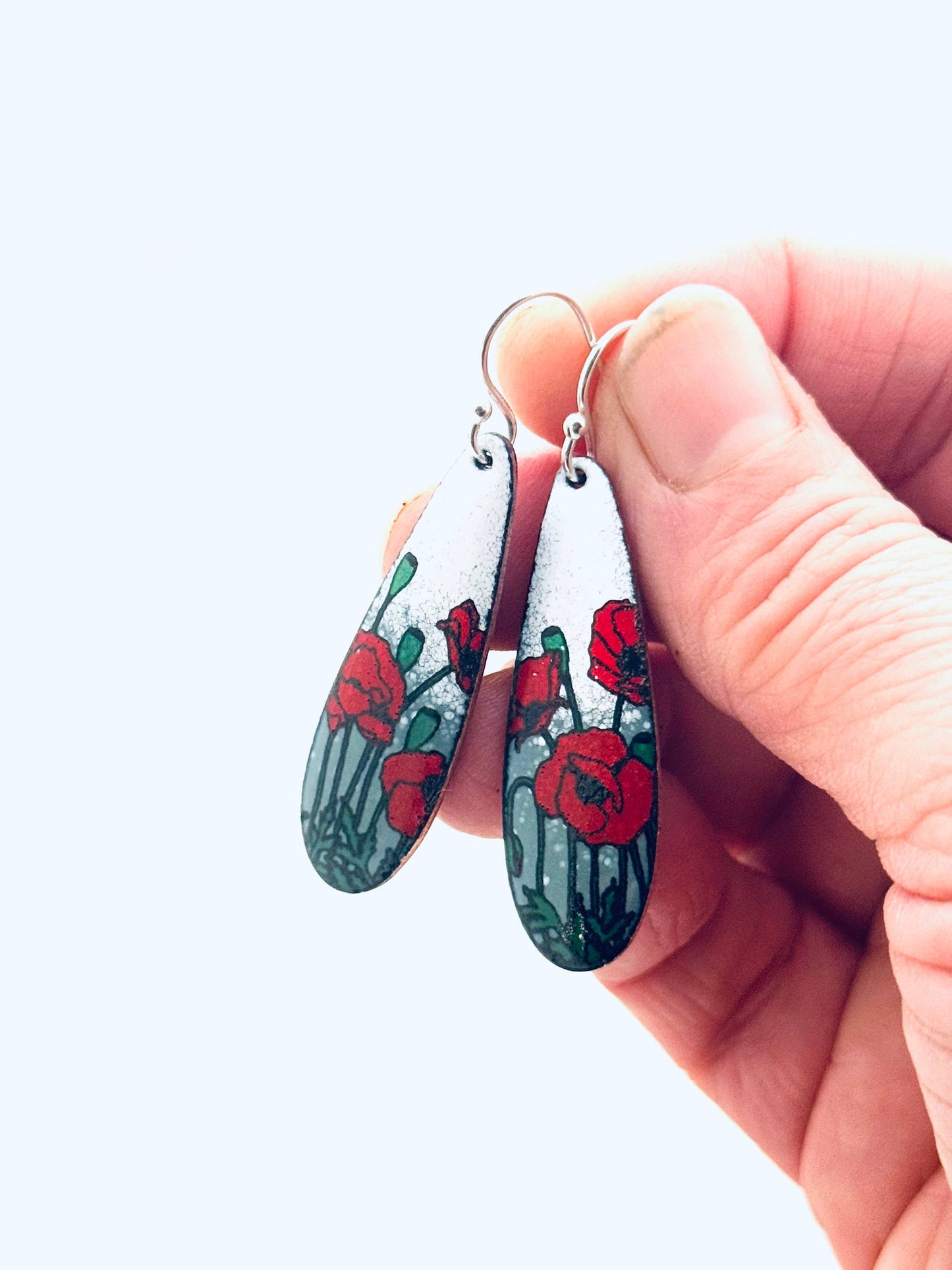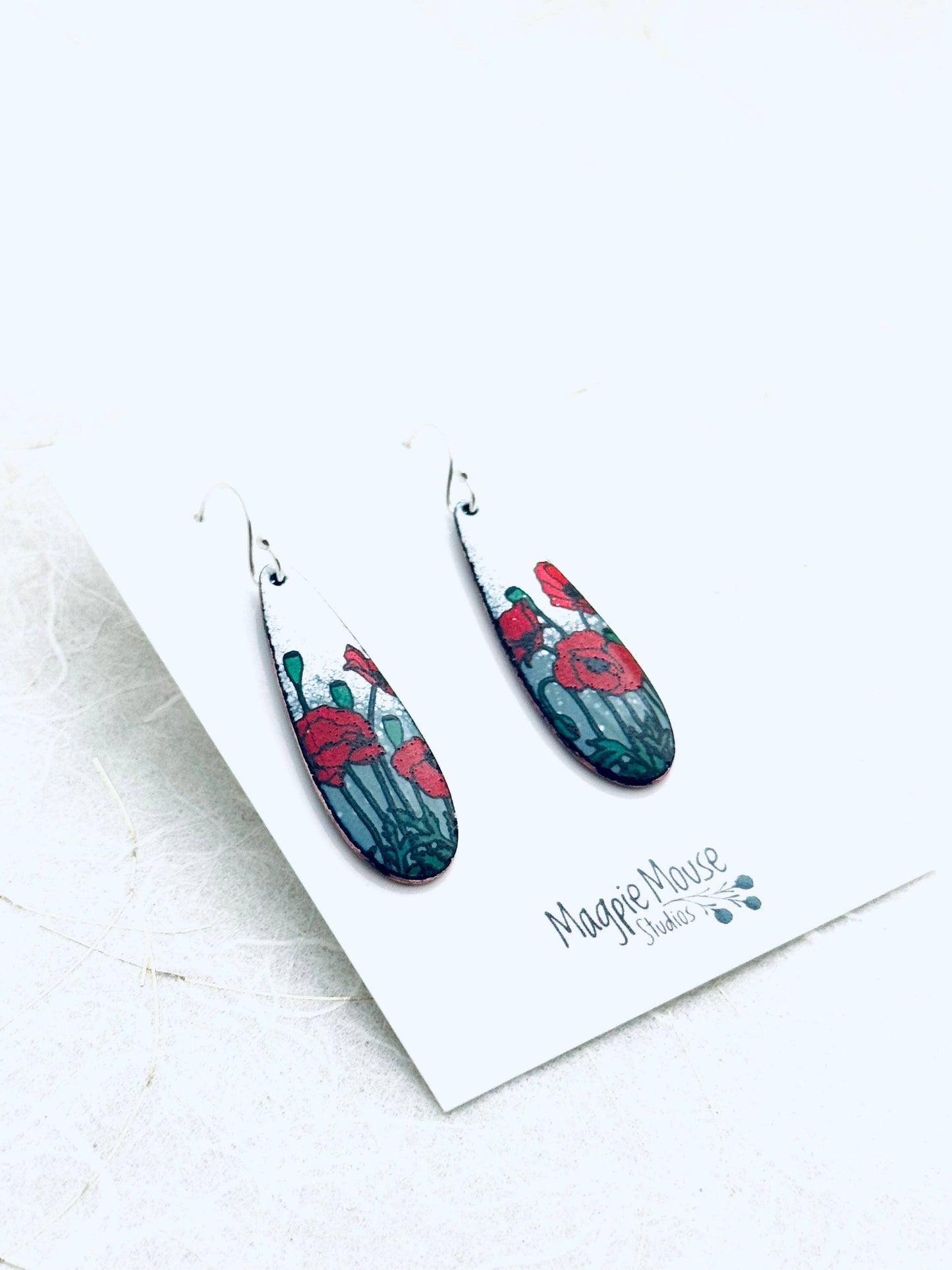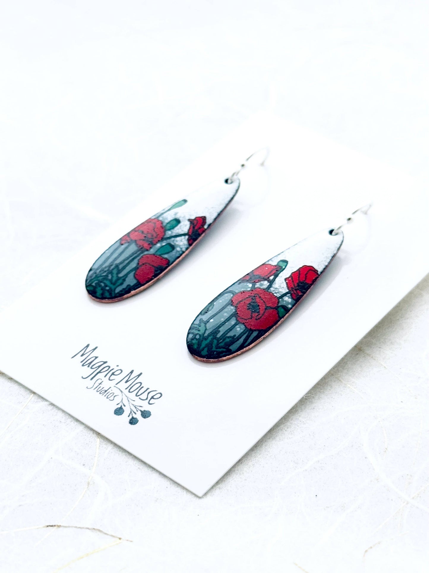 Long Teardrop Poppy Earrings, Grey and White Enamel