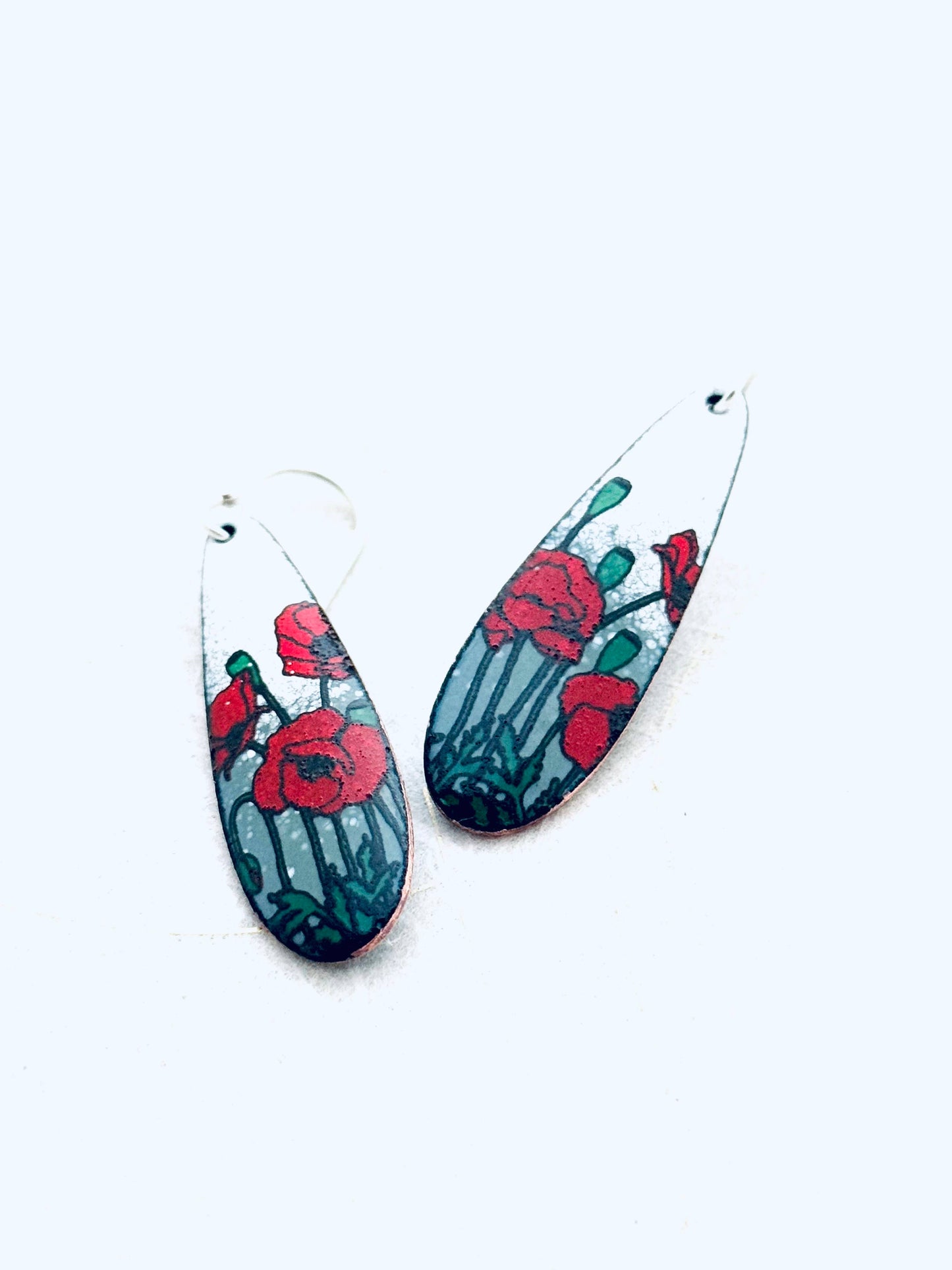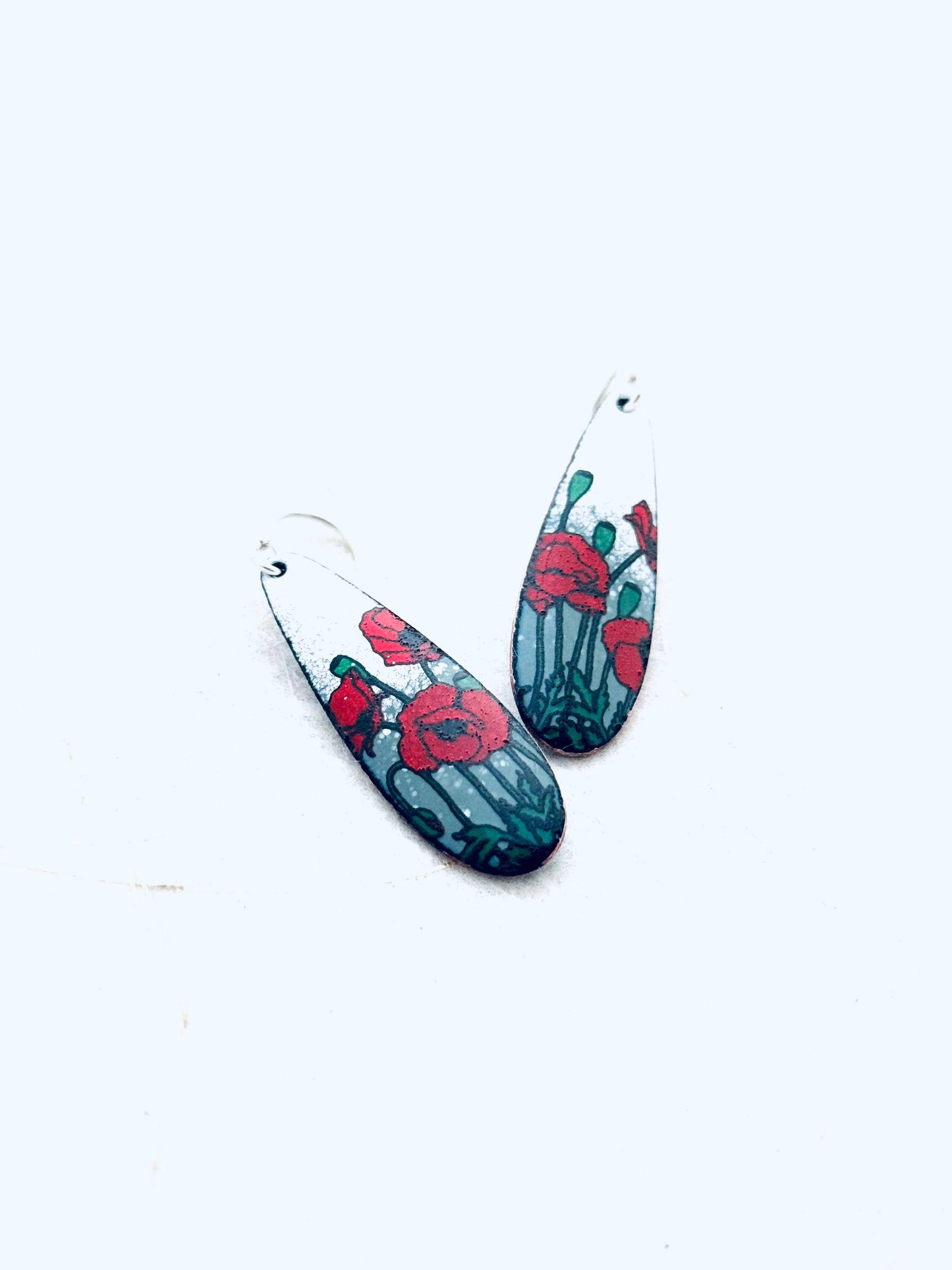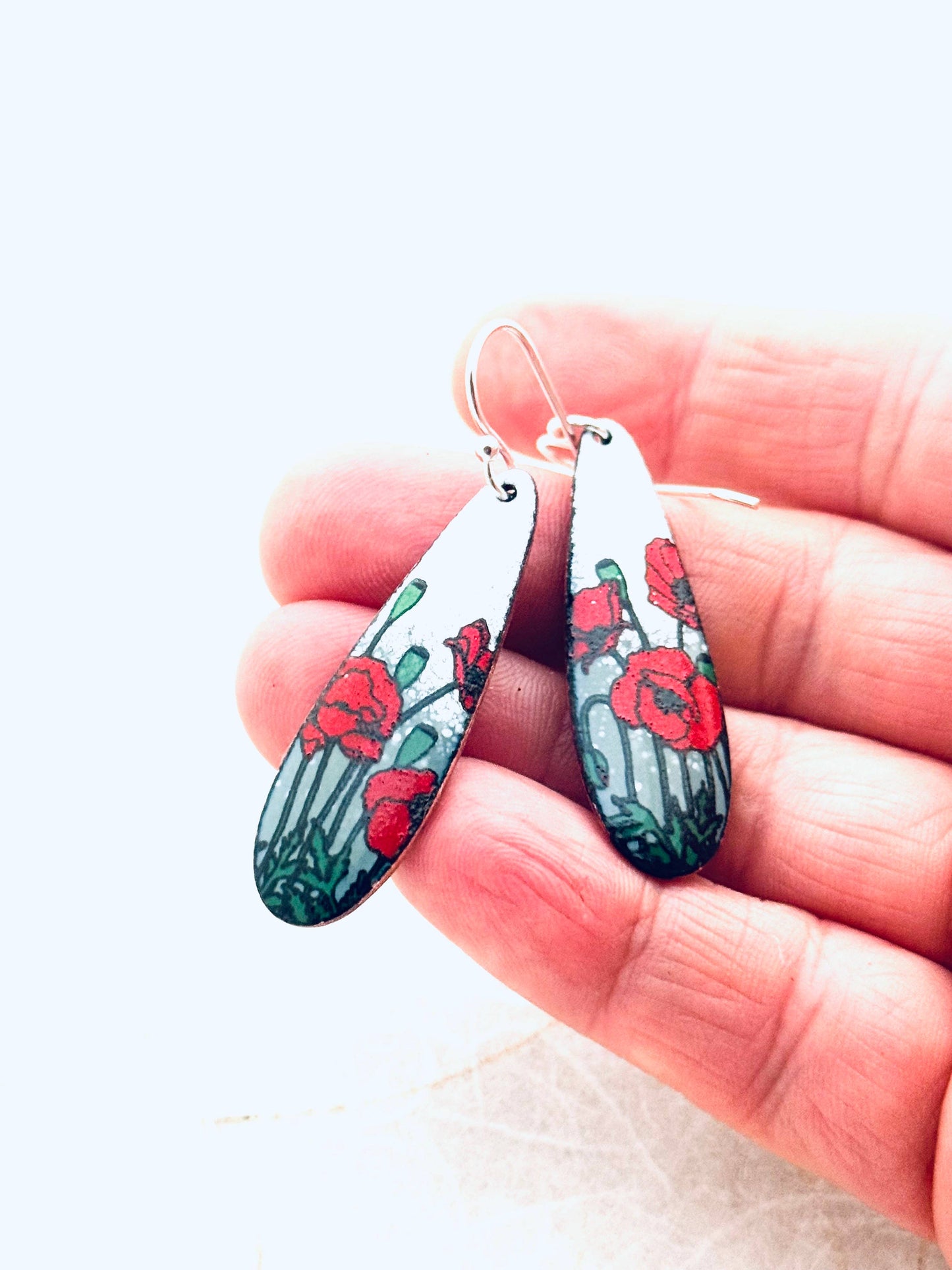 Long Teardrop Poppy Earrings, Grey and White Enamel