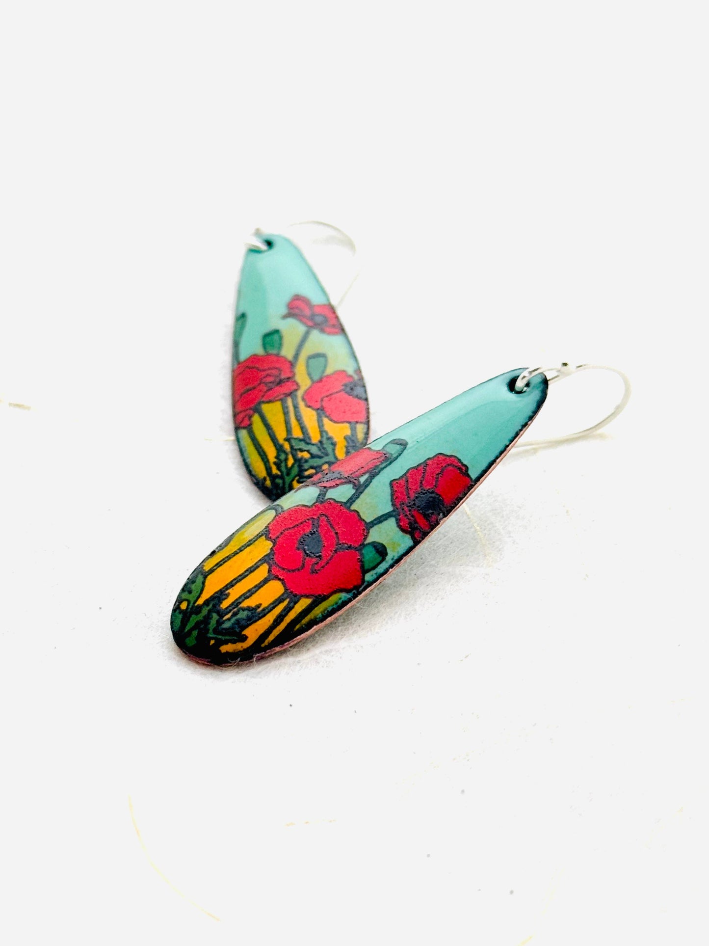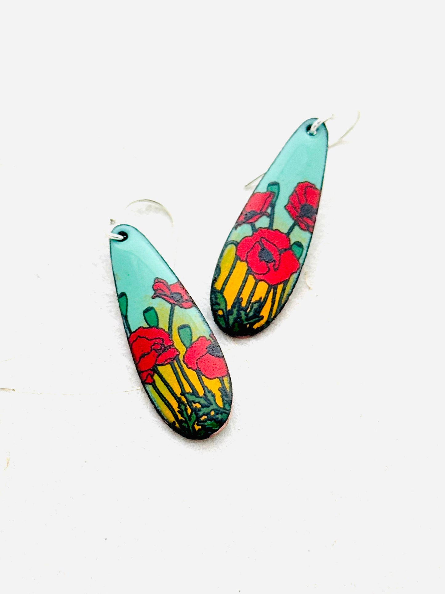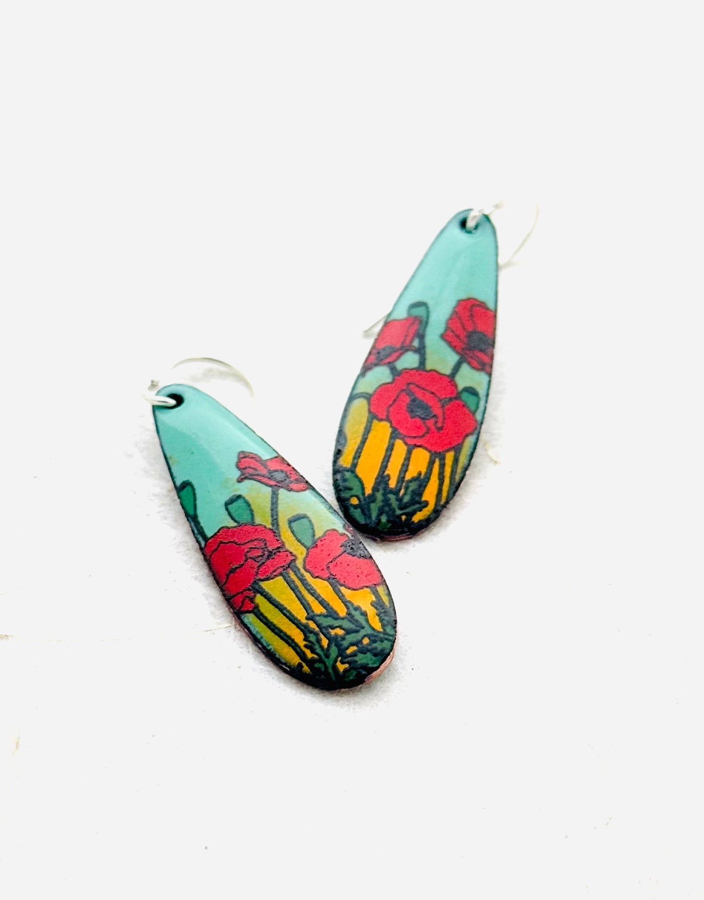 Long Teardrop Poppy Earrings, Mint Green and Yellow Enamel