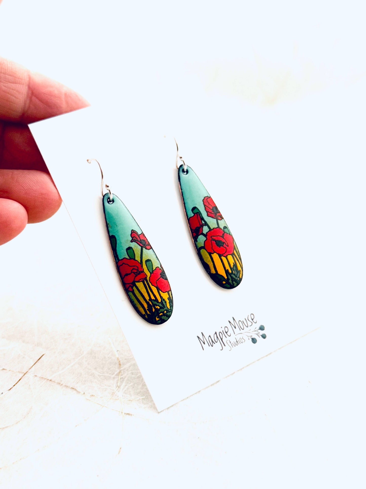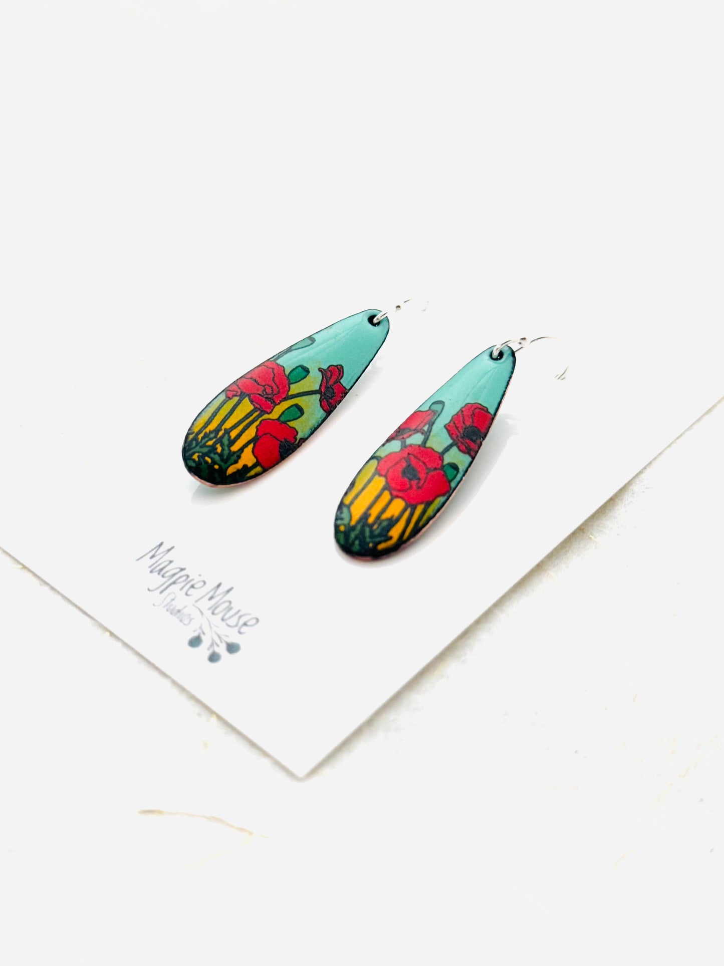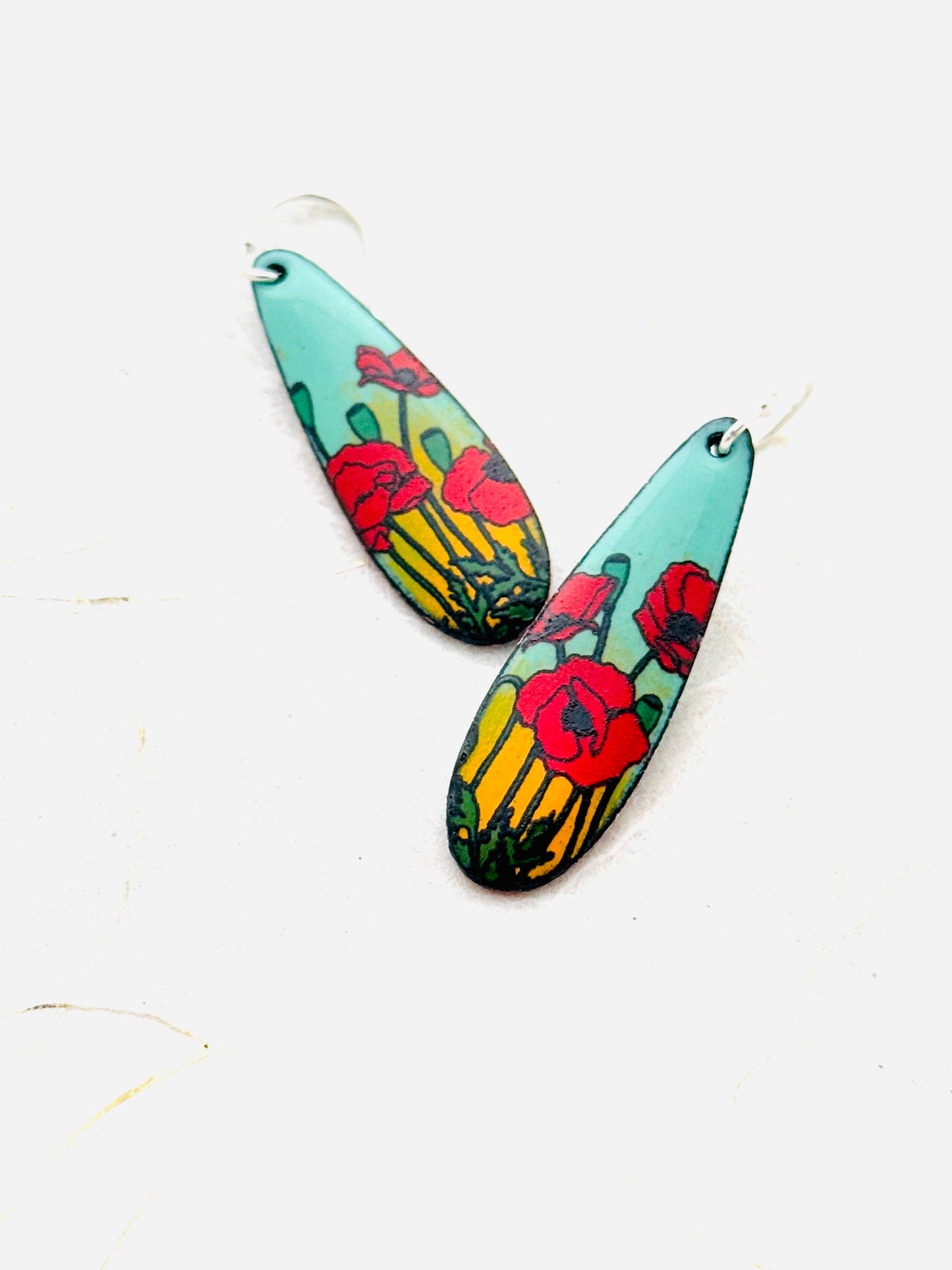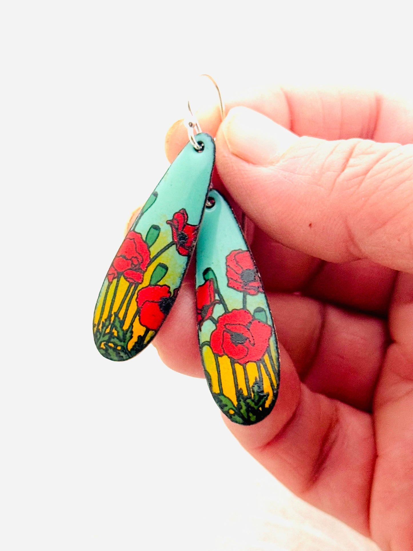 Long Teardrop Poppy Earrings, Mint Green and Yellow Enamel
