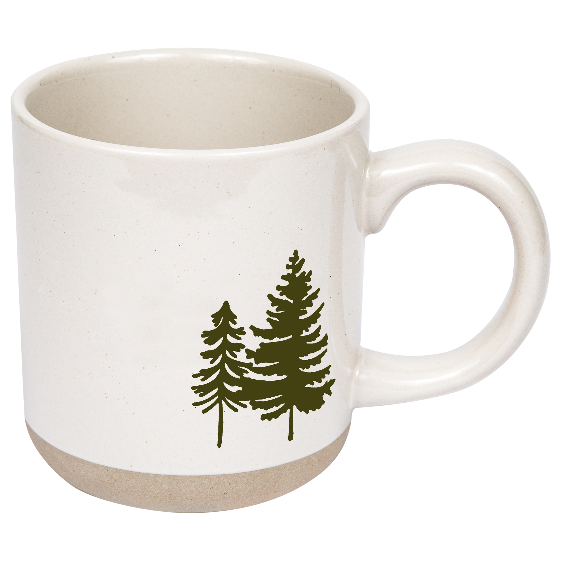 DETAILS: • 14oz Stoneware Style Mug • Size: 3.31 x 3.93" (5.19" w/handle) • Original Design: Green Trees • Design on Both Sides of Mug • Cream Mug • Speckled Design with Natural Bottom Details • Each piece is hand-crafted, making the character of each mug perfectly unique. There may be slight variations. • Designed in the USA