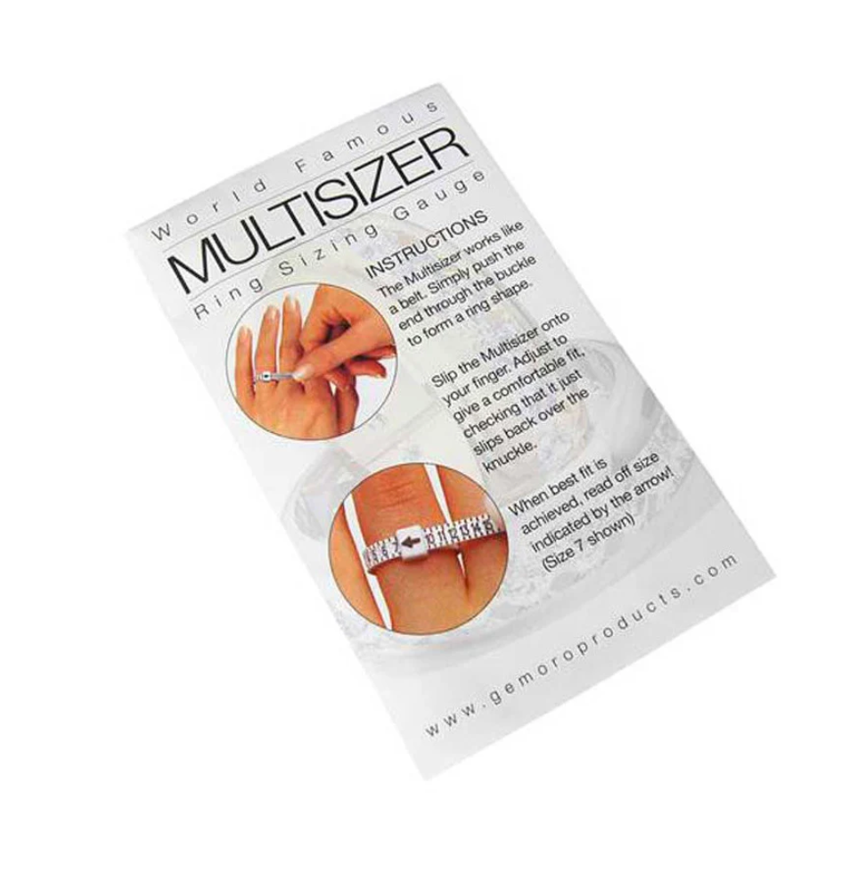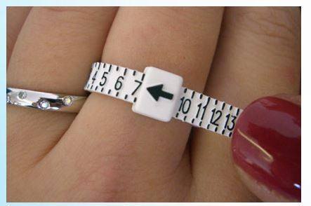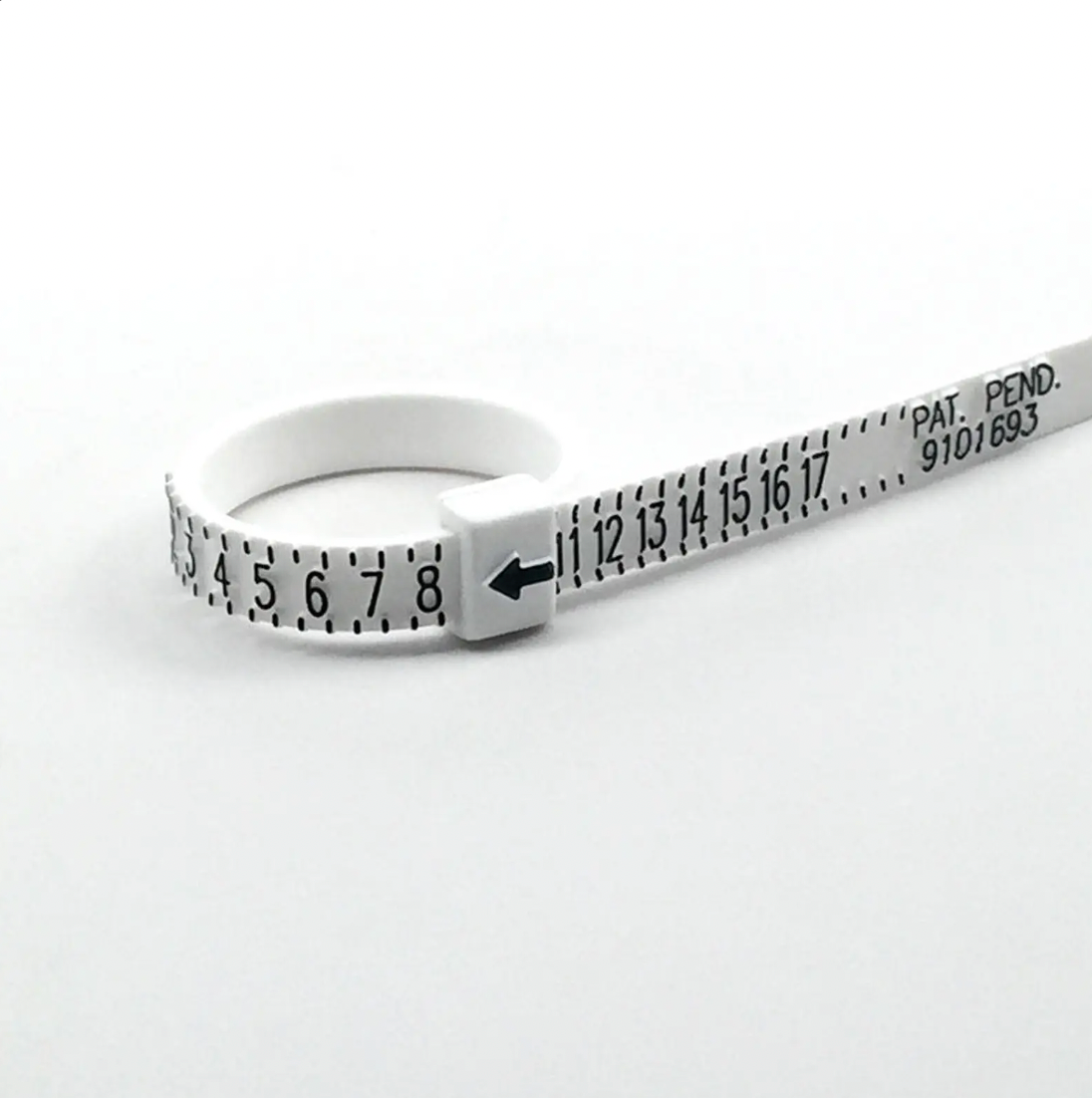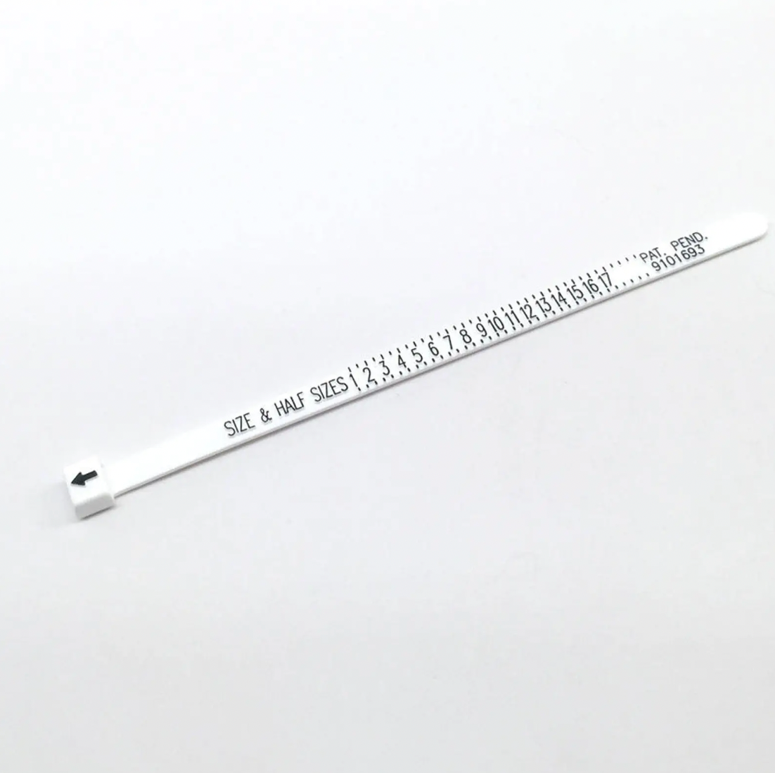 Use this handy little tool to measure your own finger, and be sure what your ring size is before ordering! Slip the flexible plastic belt over your finger and slide to fit. The arrow will point to the line with your ring size.