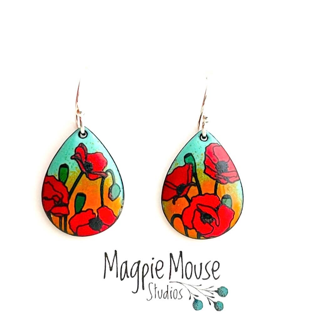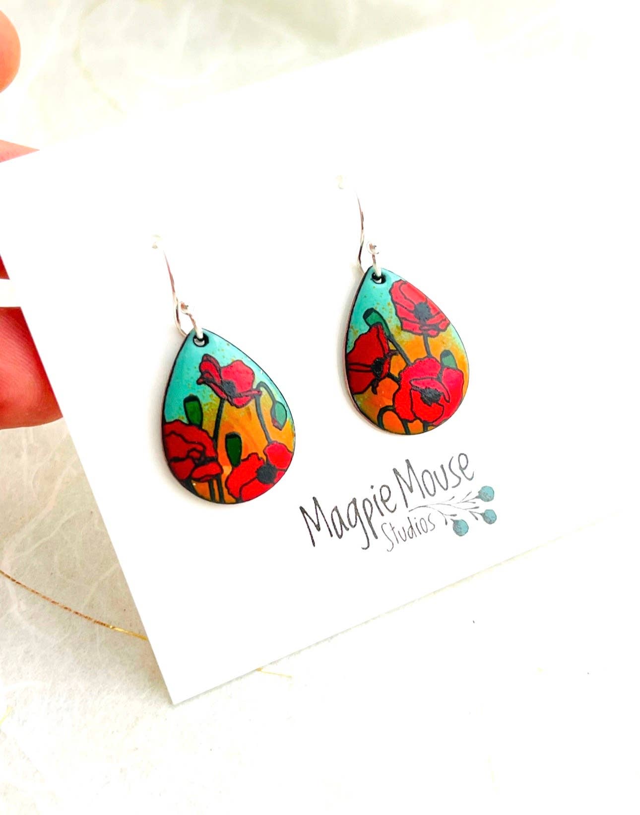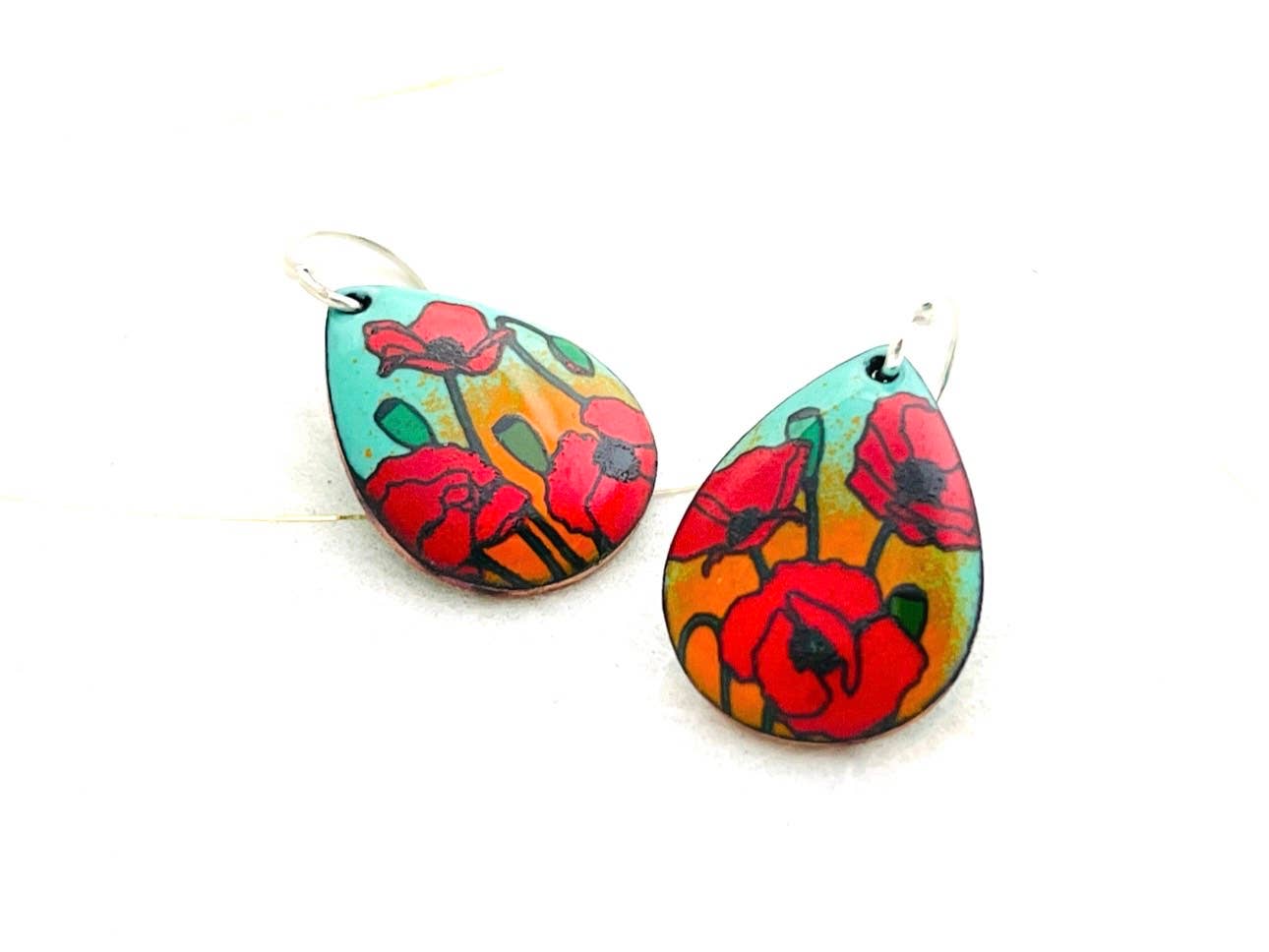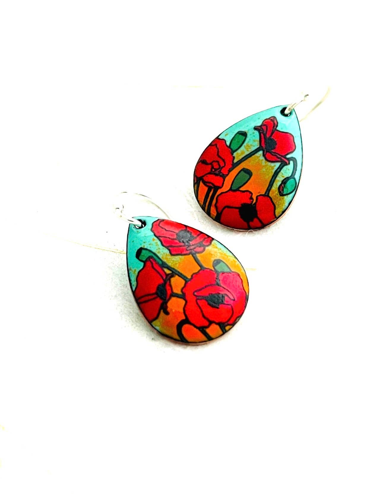 Layered mint green & orange enamel with kiln fused red poppy print on top layer of glass. Enameled on teardrop shaped copper.